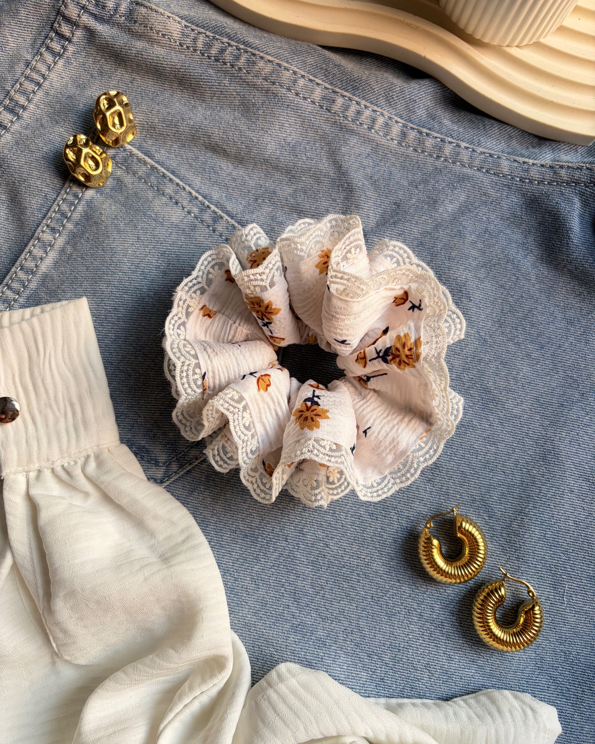 Each scrunchie is crafted from soft, breathable fabric adorned with dainty floral prints and finished with delicate lace trimming — creating the perfect blend of elegance and comfort.