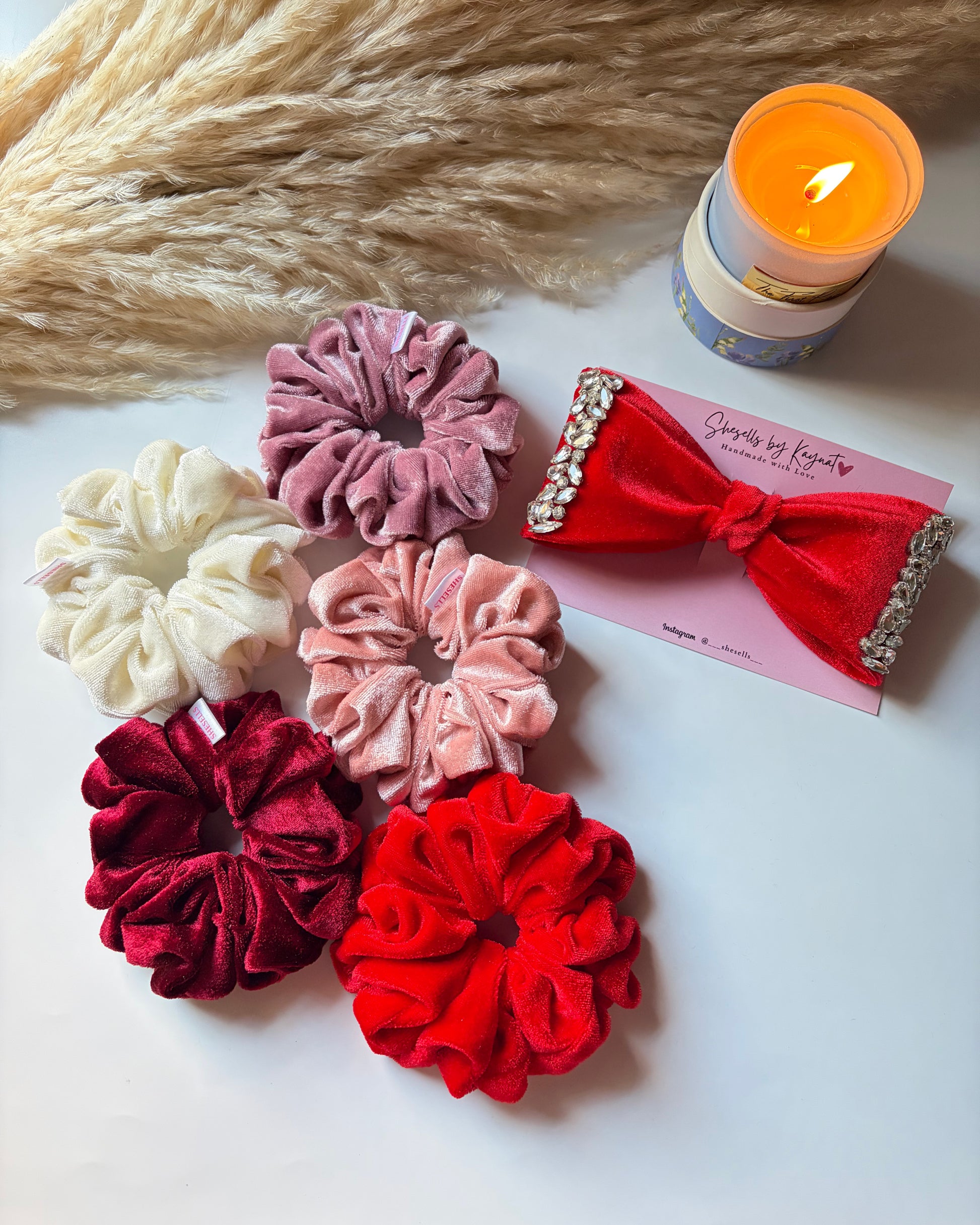 A dreamy Valentine combo featuring a red velvet crystal bow paired with a mix of velvet and silk organza scrunchies in romantic shades. Perfect for gifting or treating yourself.