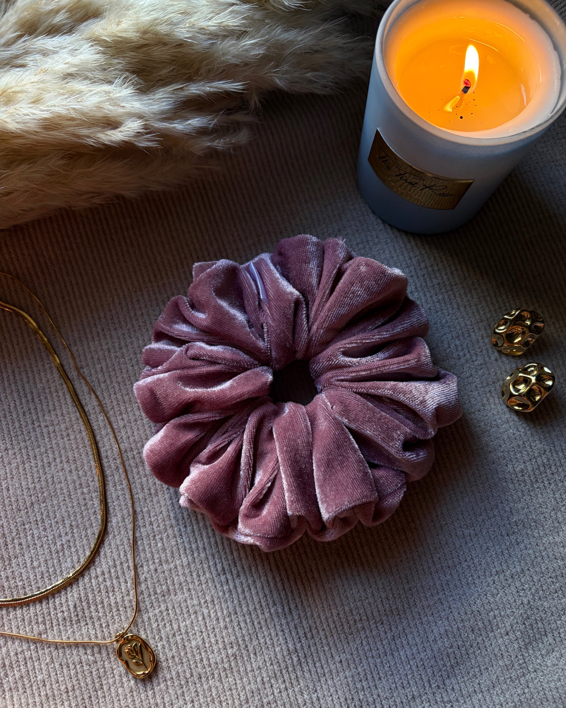 A muted mauve velvet scrunchie for a classy and graceful look.