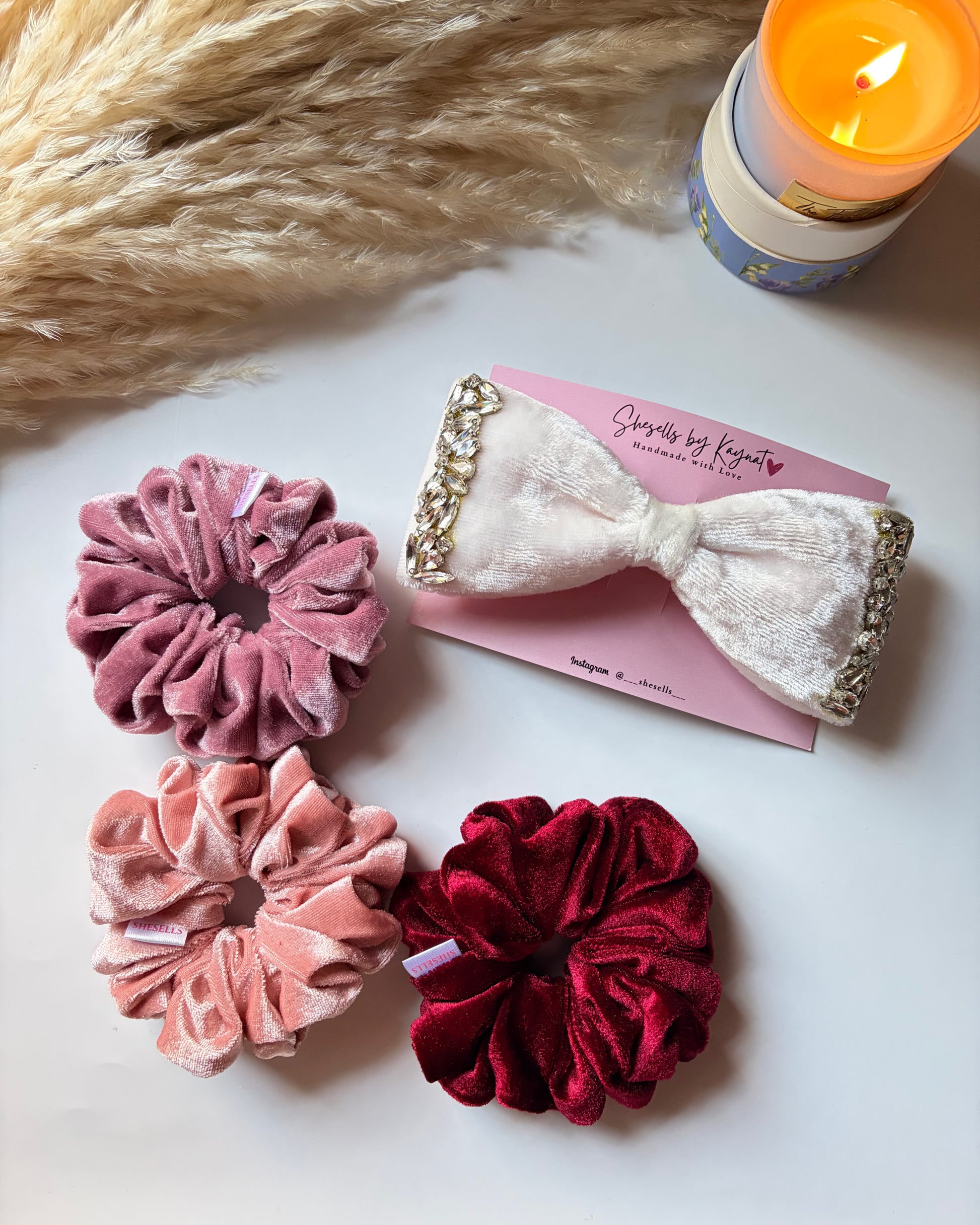 An elegant ivory velvet crystal bow paired with three romantic-toned velvet scrunchies for a timeless Valentine look.